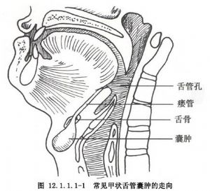 甲状舌管囊肿是胚胎期的甲状舌管退化不全而形成的先天囊肿,通常位于颈部中线、舌骨下,呈园形,直径约2-3厘米,表面光滑无压痛。检查时囊肿固定,不能向上及左右推移,但吞咽或伸舌时肿块向上移动为其特征。大而浅表的囊肿透光试验阳性,较小的囊肿可扪到一条索带连接舌骨。在青春期,由于囊内分泌物潴留或并发感染,囊肿可破溃形成瘘管,瘘管可向上延伸,紧贴舌骨前后或穿过舌骨直达盲孔,由瘘口经常排出半透明粘液,经过一段时间后,瘘管可暂时愈合而结痂,不久又因分泌物潴留而破溃,这样时发时愈,在瘘口上方可扪及一条向舌骨方向潜行的索带组织。