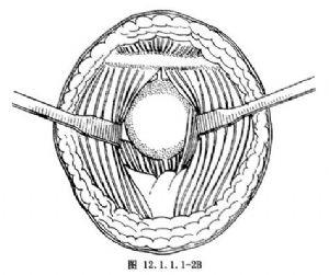 先自囊肿的前、下及两侧方分离,其蒂部多在上方与舌骨相连。在舌骨上下缘分别有颏舌骨肌和胸骨舌骨肌附着。在舌骨中段,紧靠舌骨锐性离断前述肌肉,以骨剪切断舌骨的中央部分0.5~1cm,游离的舌骨仍与囊肿相连(图12.1.1.1-3)。继续向上追踪舌骨与舌根盲孔间的管索状组织,将其与囊肿一并切除。若将舌根以下咽部切开,则需要以细可吸收缝线缝合。