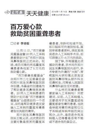 由郑州民生耳鼻喉医院联合郑州市二七区慈善总会创建的“郑州民生耳鼻喉慈善关爱基金”,将援助20例人工耳蜗患者,每位患者可获得2万元基金资助,同时患者还可获得国外进口公司的相应费用减免。>>>咨询了解优惠详情