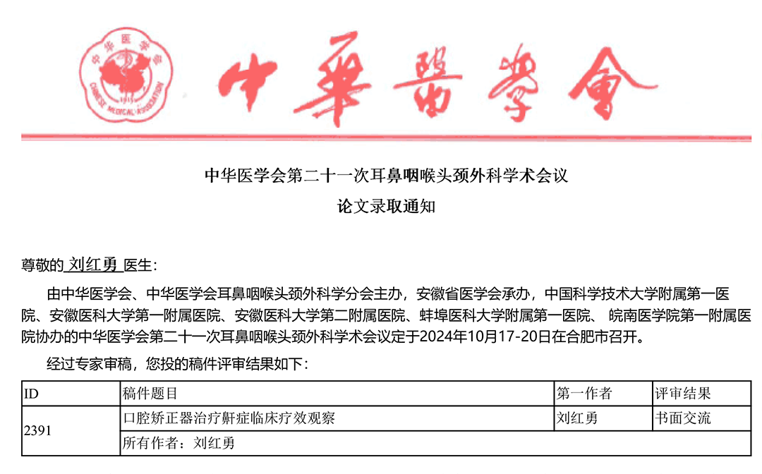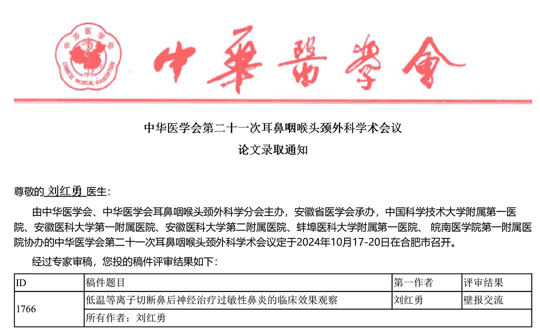 杏林耕耘,硕果飘香。在即将召开的中华医学会第二十一次耳鼻咽喉头颈外科学术会议上,郑州民生耳鼻喉医院耳科、鼻咽喉科团队积极参与,踊跃投稿。我院共投稿3篇,均获大会高度认可,1篇入选壁报交流,2篇入选书面交流。此次论文被遴选,充分彰显了我院临床医师的深厚学术功底,亦标志着我院在科研领域迈出坚实新步。