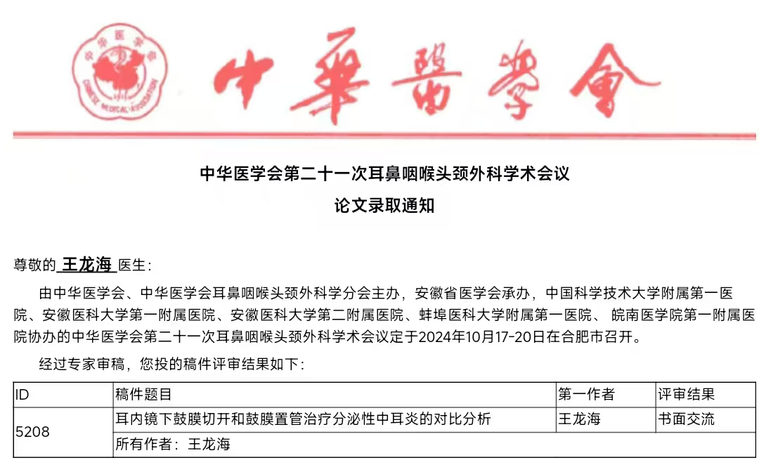 此外,值得一提的是,早在2024年6月,王龙海主任撰写的《碳酸氢钠联合过氧化氢溶液治疗真菌性外耳道炎的体会》一文,在中华医学会2024年听觉和平衡医学学术会议上便已崭露头角,不仅成功被大会收录,更荣获论文发言的机会。该论文深入探讨了碳酸氢钠联合过氧化氢溶液在治疗真菌性外耳道炎方面的创新应用,为临床治疗开辟了新的路径。