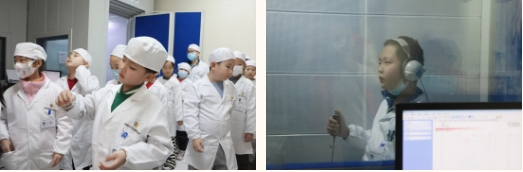小朋友们刚一走进医院大门,整齐摆放的“医生服”瞬间吸引了他们的目光。孩子们迫不及待地穿上白大褂,变身为英姿飒爽的“小小耳鼻喉医生”。欢乐合影后,活动正式拉开帷幕。