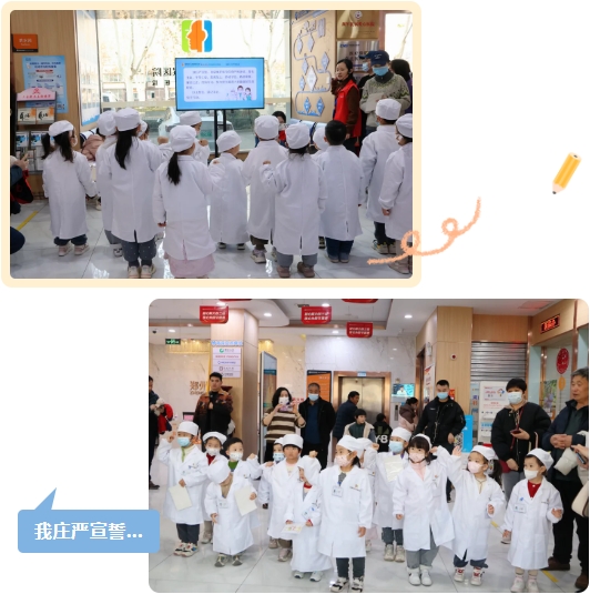 在工作人员的带领下,孩子们站成整齐的队列,庄严宣誓:“我庄严宣誓,自觉维护医学的庄严和神圣......努力担当起增进人类健康的崇高职责。”稚嫩的声音里充满坚定,仿佛已经肩负起未来的使命。此刻,家长们在一旁目光温柔,脸上写满欣慰与感动。