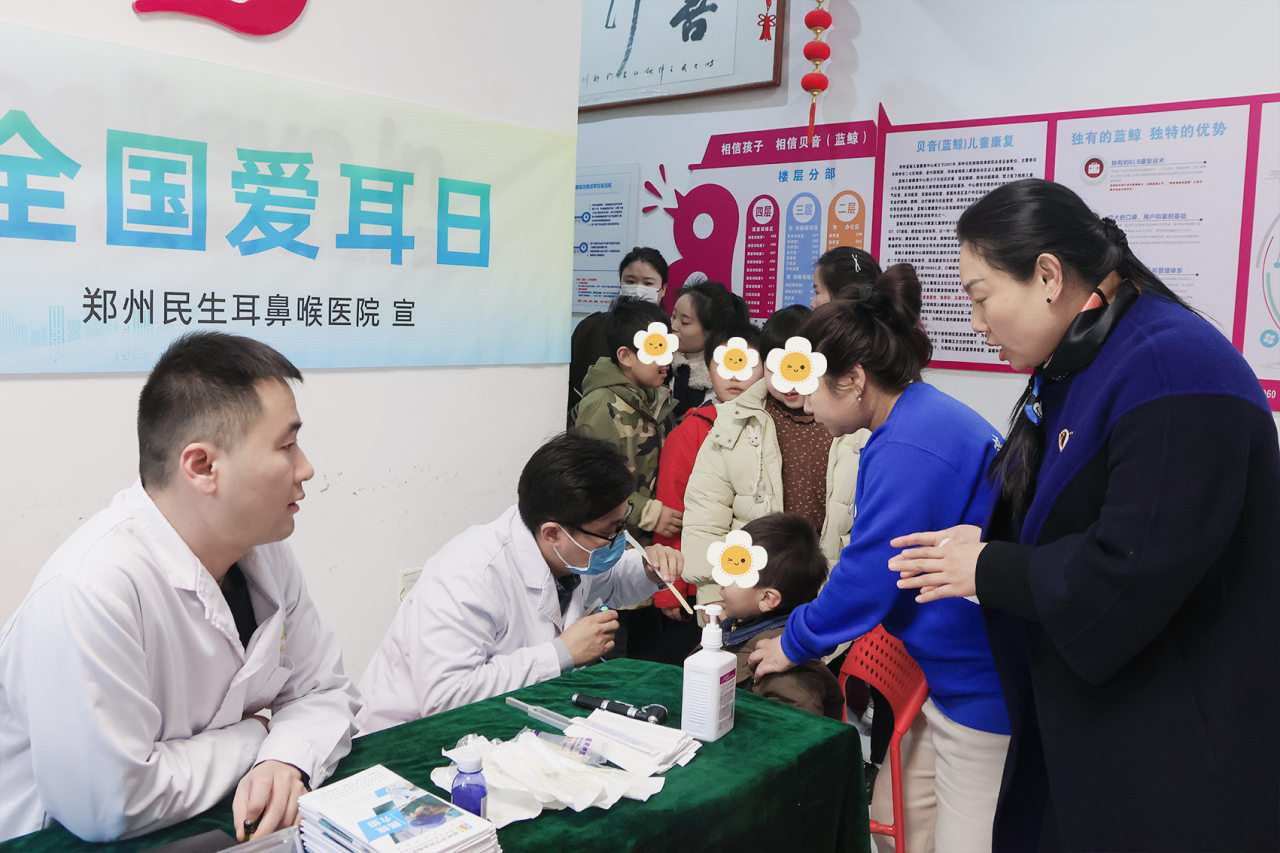 2月28日,郑州民生耳鼻喉医院耳鼻喉专家刘红勇主任、听力中心孙洋主任走进蓝鲸儿童语言康复中心,开展爱耳日义诊活动,为特殊儿童带去专业的耳鼻喉健康检查与医疗指导。