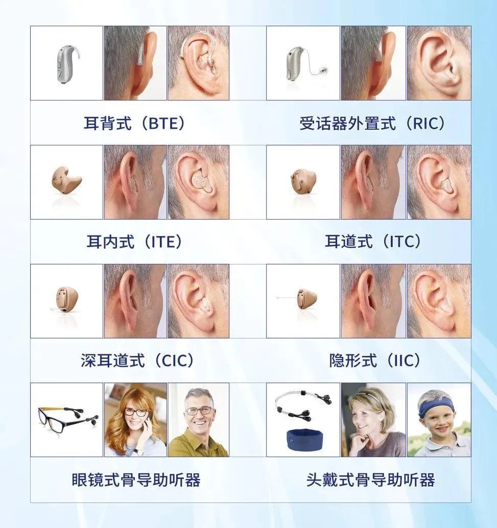 气导助听器(通过空气传导声音):包括盒式、耳背式、耳内式、耳道式和完全耳道式助听器,适用于大部分听力损失人群。