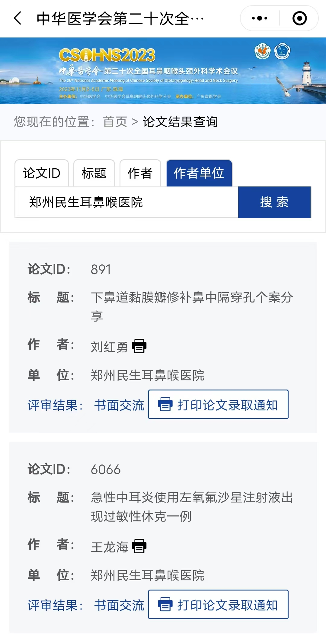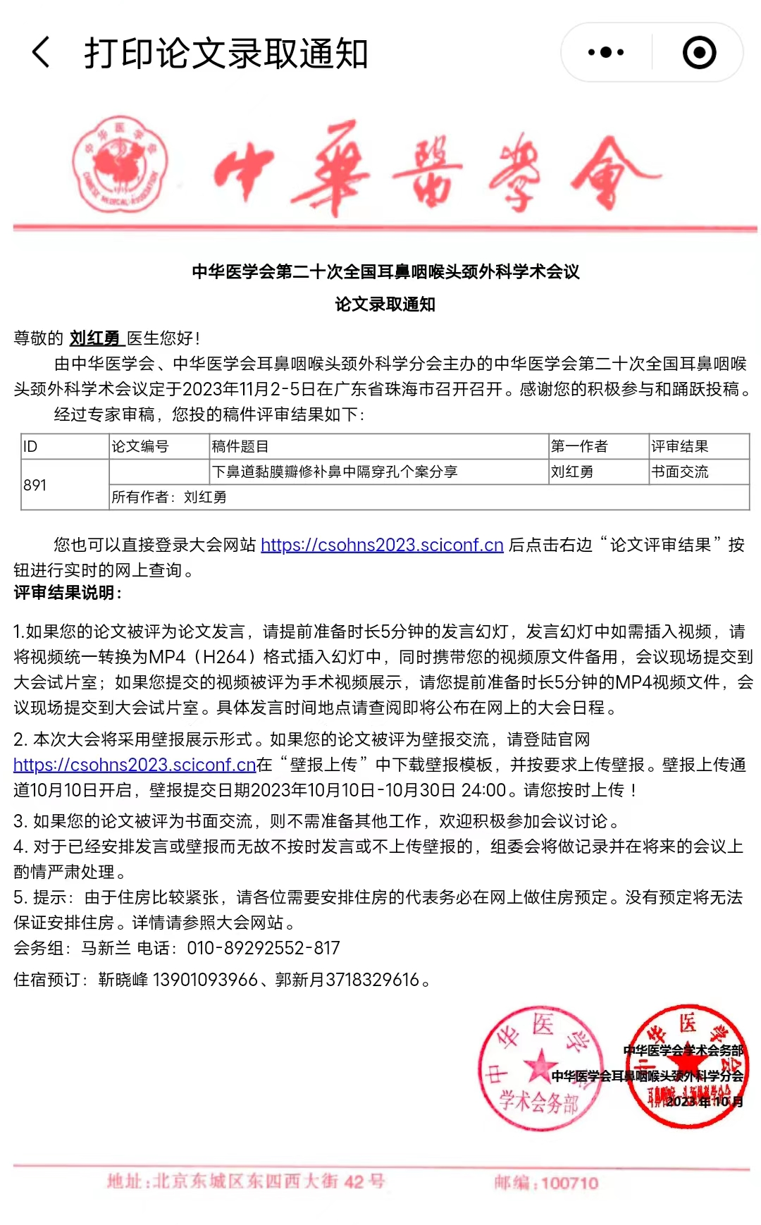近日,郑州民生耳鼻喉医院耳科病区主任王龙海、鼻咽喉病区主任刘红勇分别撰写的学术论文《急性中耳炎使用左氧氟沙星注射液出现过敏休克一例》和《下鼻道黏膜瓣修补鼻中隔穿孔个案分享》双双被中华医学会收录,二者将以书面交流的形式在本次会议进行展示。这是继2022年我院鼻咽喉科、耳科、麻醉科踊跃参加学术会议,积极向大会投稿4篇,全部被“中华医学会第19次全国耳鼻咽喉头颈外科学术会议”录用后,再次被中华医学会录用。
