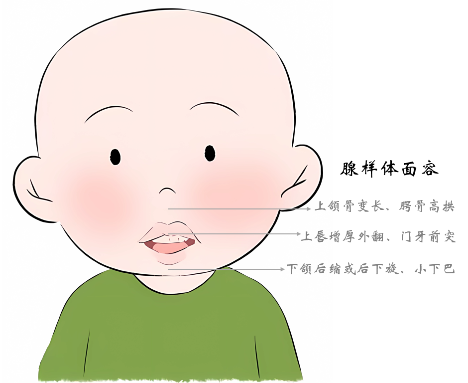 长期的腺样体肥大和张口呼吸习惯会影响颌面部骨骼发育,使口唇无法自行闭合,唇肌松弛,形成腺样体面容,常有以下异常表现: