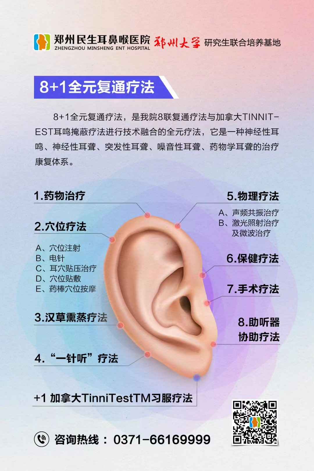 8+1全元复通疗法,是我院8联复通疗法与加拿大TINNITEST耳鸣掩蔽疗法进行技术融合的全元疗法,它是一种神经性耳鸣、神经性耳聋、突发性耳聋、噪音性耳聋、药物学耳聋的治疗康复体系。