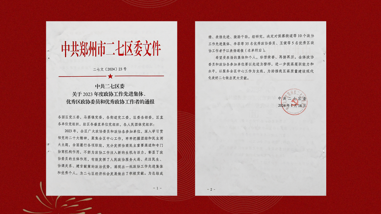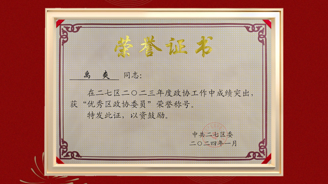 2024年1月22日-24日,中国人民政治协商会议郑州市二七区第十届委员会第三次会议在区会议中心三楼圆满举行。来自各界别的政协委员肩负重托,满怀参政议政热情汇聚一堂,共商发展大计、共谋改革良策。在本次盛会上,二七区政协常委、郑州民生耳鼻喉医院院长禹爽被授予“优秀区政协委员”荣誉称号。这一荣誉是对他恪尽职守、积极履职尽责的高度认可。