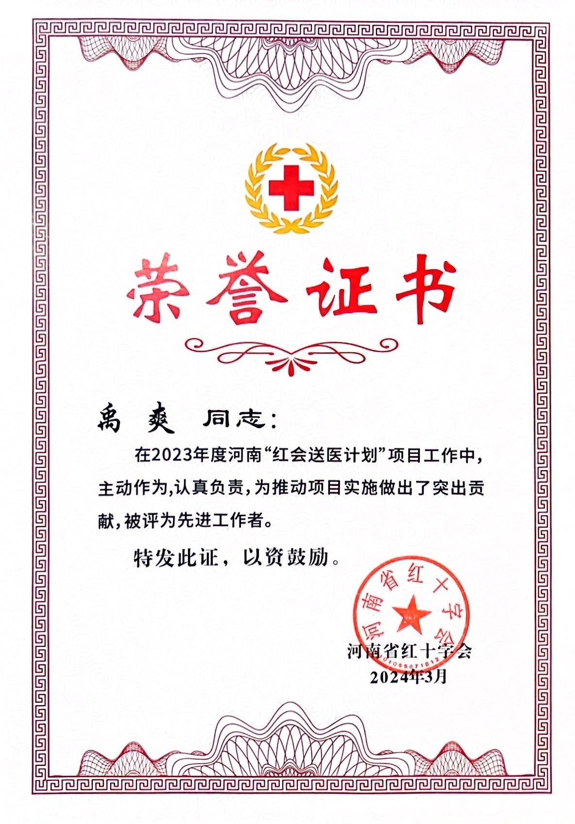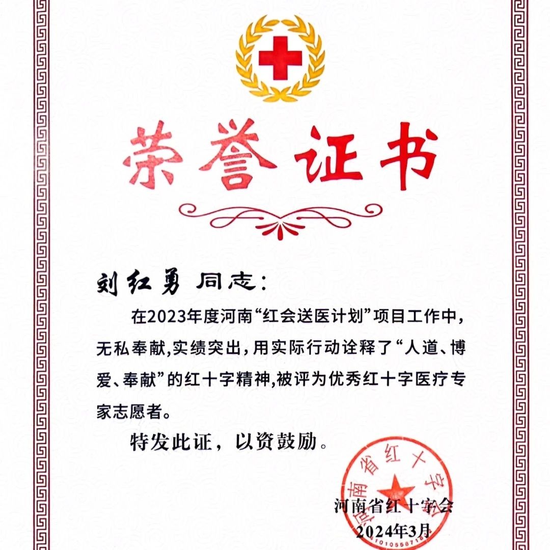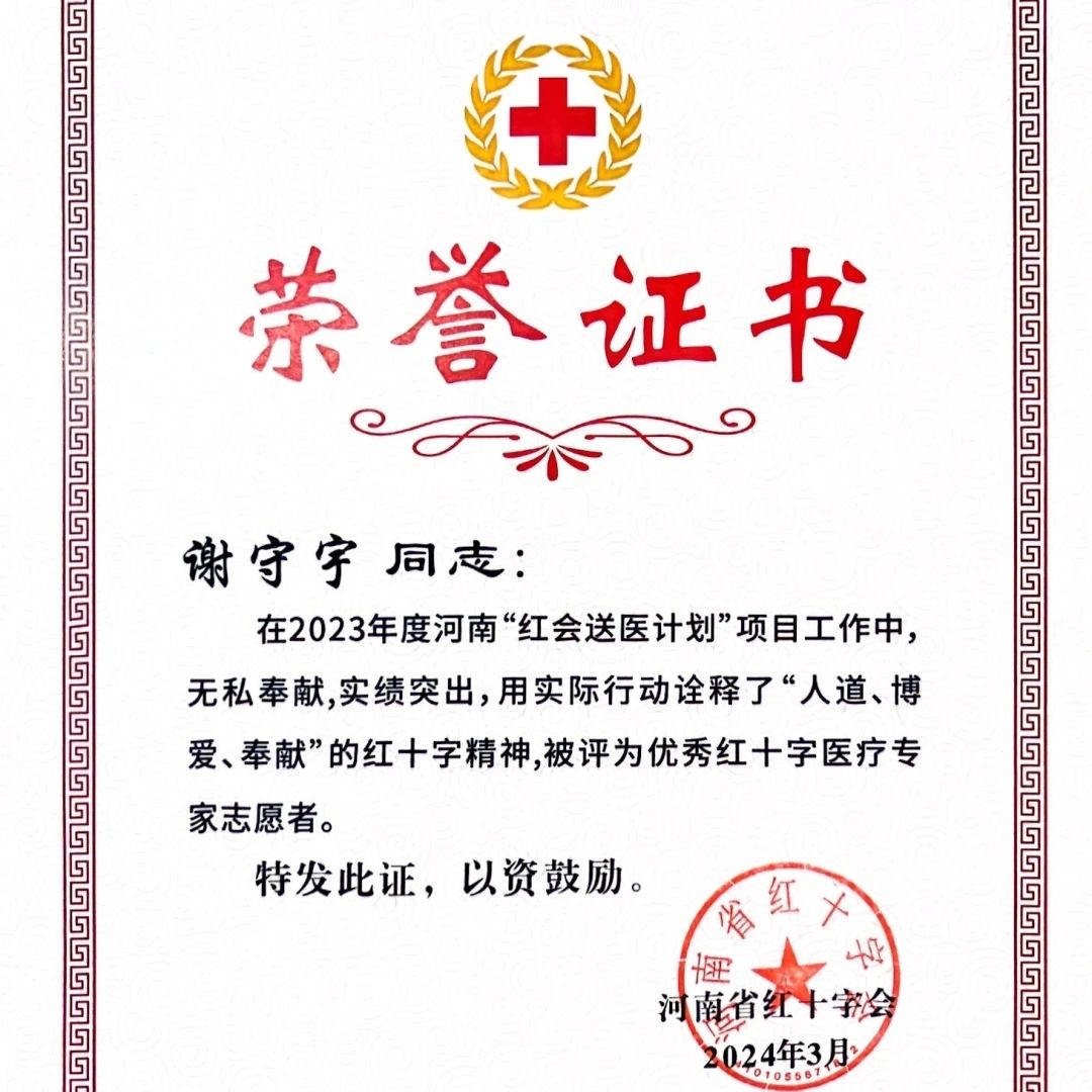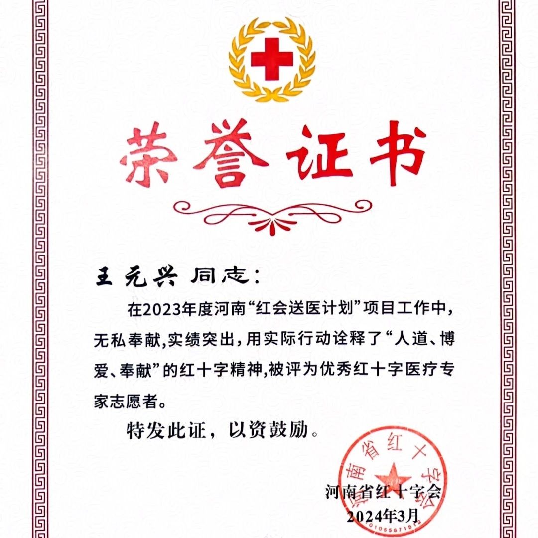 荣誉的取得,离不开院领导的大力支持,更离不开全体同仁的共同努力和无私奉献。这是我院首次荣获河南省“红会送医计划”的荣誉表彰,标志着我们在公益医疗事业中迈出了坚实的一步。禹爽院长在2023年度红会送医计划中展现了非凡的领导力和深厚的专业素养,他的主动作为和高度责任感为推动项目取得重大进展做出了突出贡献,并荣获“先进工作者”称号。