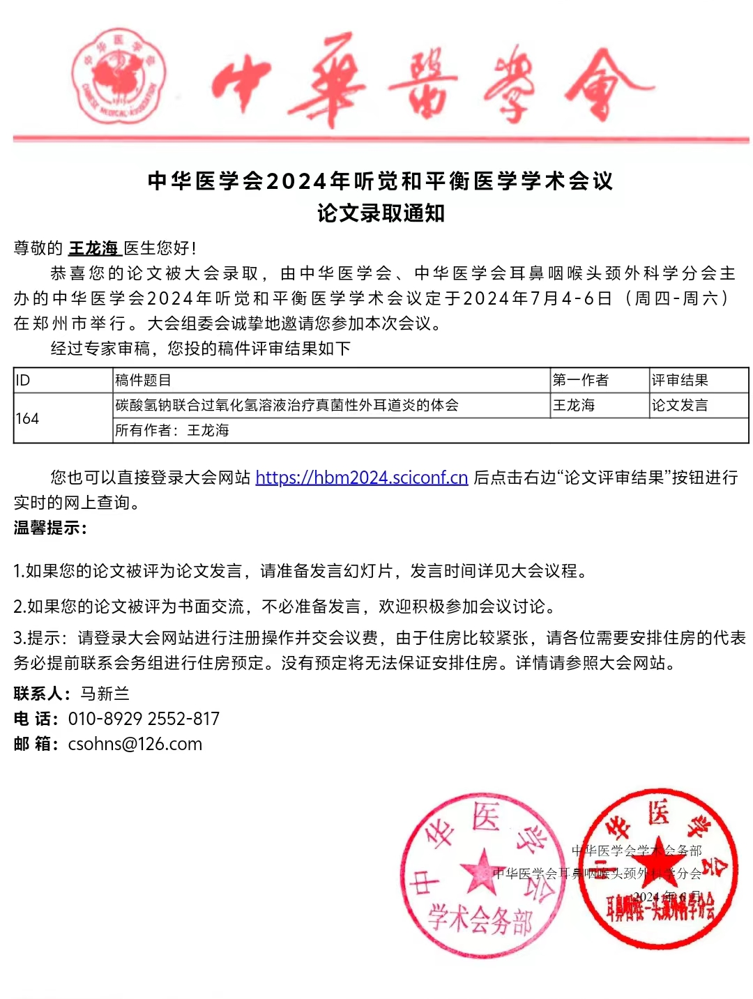 【喜报】我院王龙海主任论文获中华医学会2024听觉和平衡医学会议收录,再展学术风采!