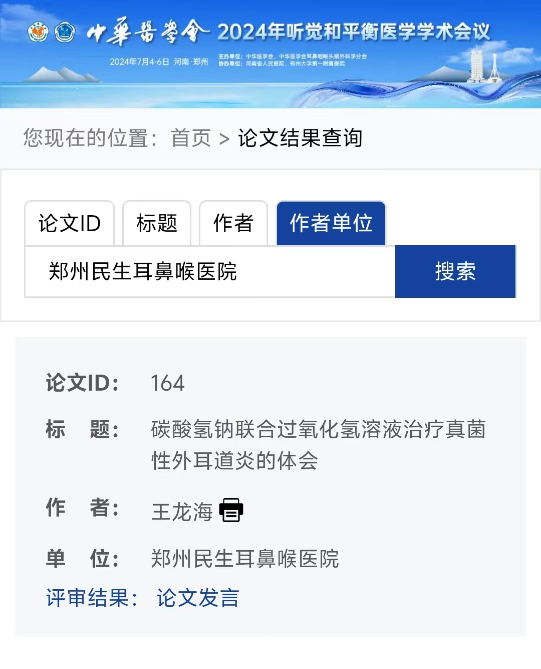 近日,我们欣喜地宣布,郑州民生耳鼻喉医院耳科病区主任王龙海撰写的论文《碳酸氢钠联合氧化氢溶液治疗真菌性外耳道炎的体会》在中华医学会2024年听觉和平衡医学学术会议上脱颖而出,成功被大会收录,并被评为论文发言。这一荣誉不仅是对王龙海主任个人学术成就的肯定,更是对郑州民生耳鼻喉医院在耳鼻咽喉头颈外科领域学术地位的进一步提升。