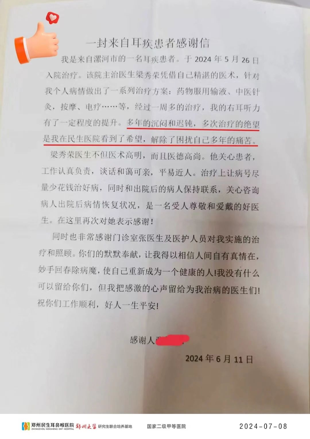 在刚刚过去的热情似火的七月,郑州民生耳鼻喉医院收到了一封耳疾患者的感谢信,字里行间真挚的话语流露着患者对医生的信任与感激,如同一股暖流淌入医者心田,也为医者带来了莫大的温暖与感动。