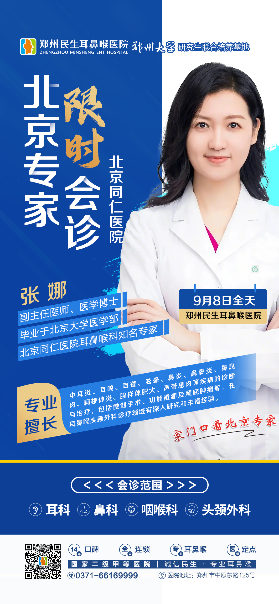 为了满足广大群众日益增长的就医需求,为就诊患者提供高效、便捷、面对面的北京专家医疗服务,9月8日(本周日),我院特邀北京同仁医院耳鼻喉科张娜主任来院会诊,让您在家门口就能享受到北京知名专家、北大医学博士的优质服务。