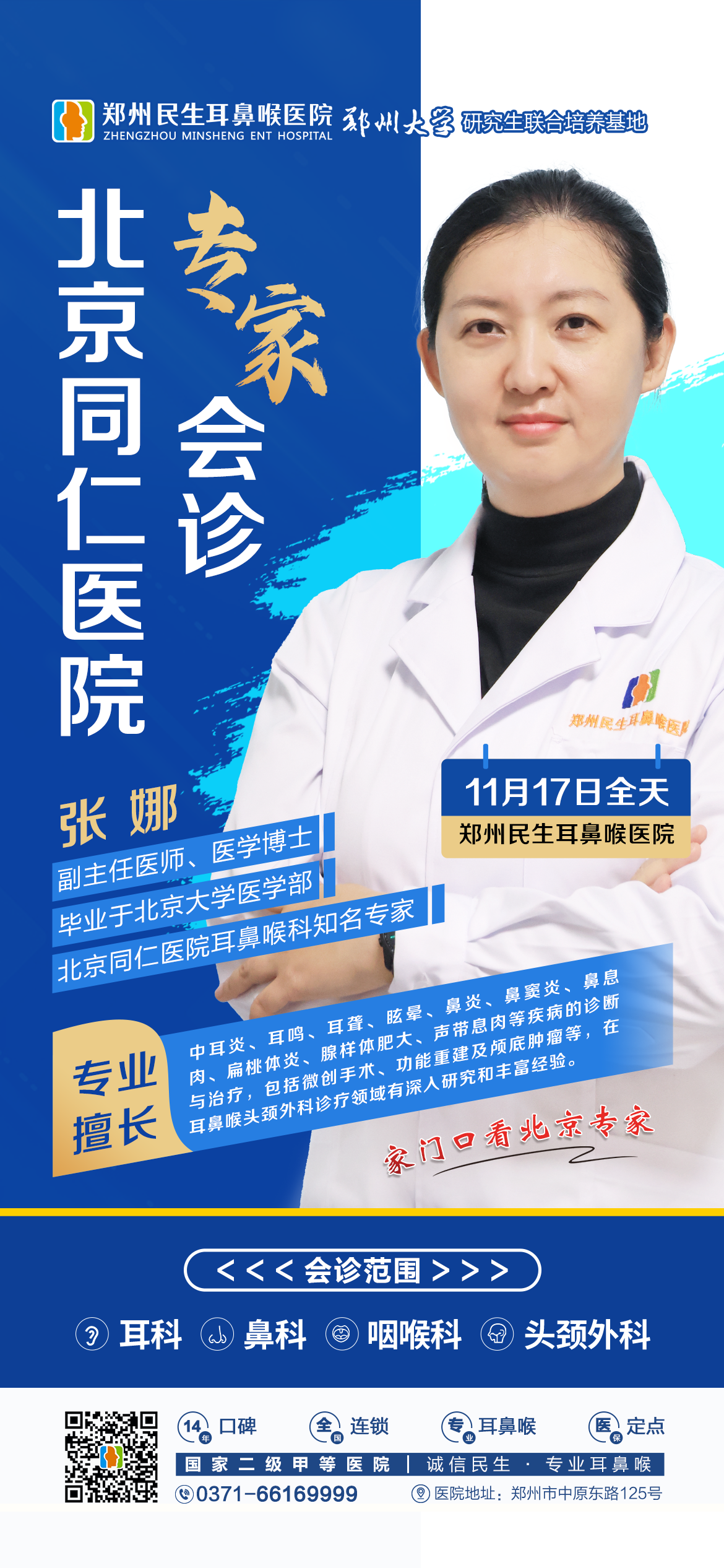 为了满足广大群众日益增长的就医需求,为就诊患者提供高效、便捷、面对面的北京专家医疗服务,11月17日(本周日),我院特邀北京同仁医院耳鼻喉科张娜主任来院会诊,让您在家门口就能享受到北京知名专家、北大医学博士的优质服务。