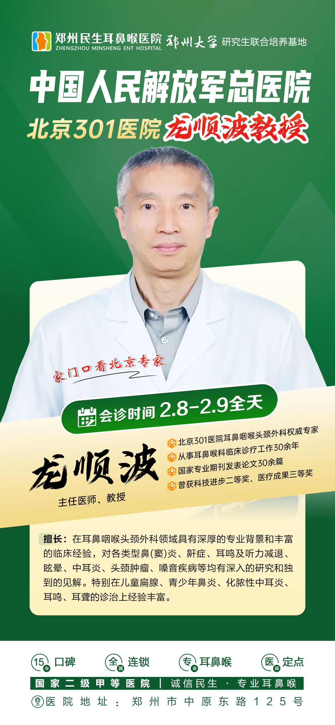 2月8-9日,北京301医院耳鼻喉专家龙顺波教授在郑州民生耳鼻喉医院开展会诊及查房,这是寒假结束前最后一波北京专家会诊!家门口就能看北京专家,机会难得,预约火热进行中!