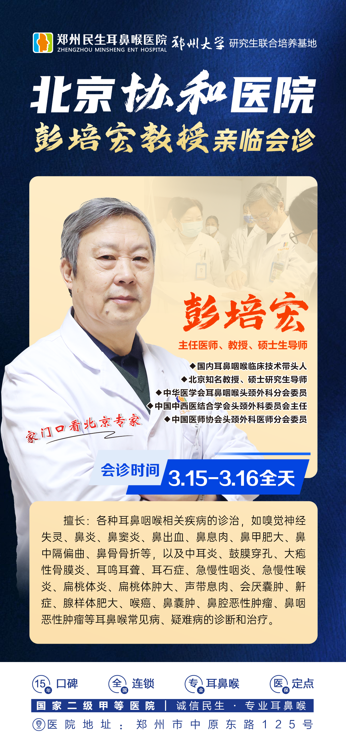 3月15-16日,北京协和医院耳鼻喉专家彭培宏教授亲临郑州民生耳鼻喉医院,为郑州及周边患者提供专业、高效的诊疗服务!