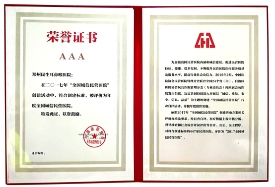 为推动民营医院医疗服务能力和质量的不断提升,培育和建设一批社会公信度高、技术质量过硬、品牌影响力强的优秀民营医院,引领和带动整个行业的健康发展。依照“创全国诚信民营医院”活动要求,经河南省医院协会举荐,郑州民生耳鼻喉医院参与了此次“全国诚信民营医院”推选,广泛接受行业、社会监督,最终从全国超过17000所民营医院中脱颖而出,荣膺“全国诚信民营医院”荣誉。